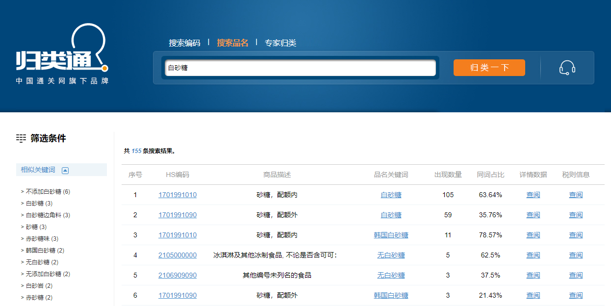 例如搜索白砂糖,就會出現(xiàn)HS編碼,海關稅金,一般都是根據(jù)百分比計算,按貨值*百分比即可確認到不同產(chǎn)品的稅金。