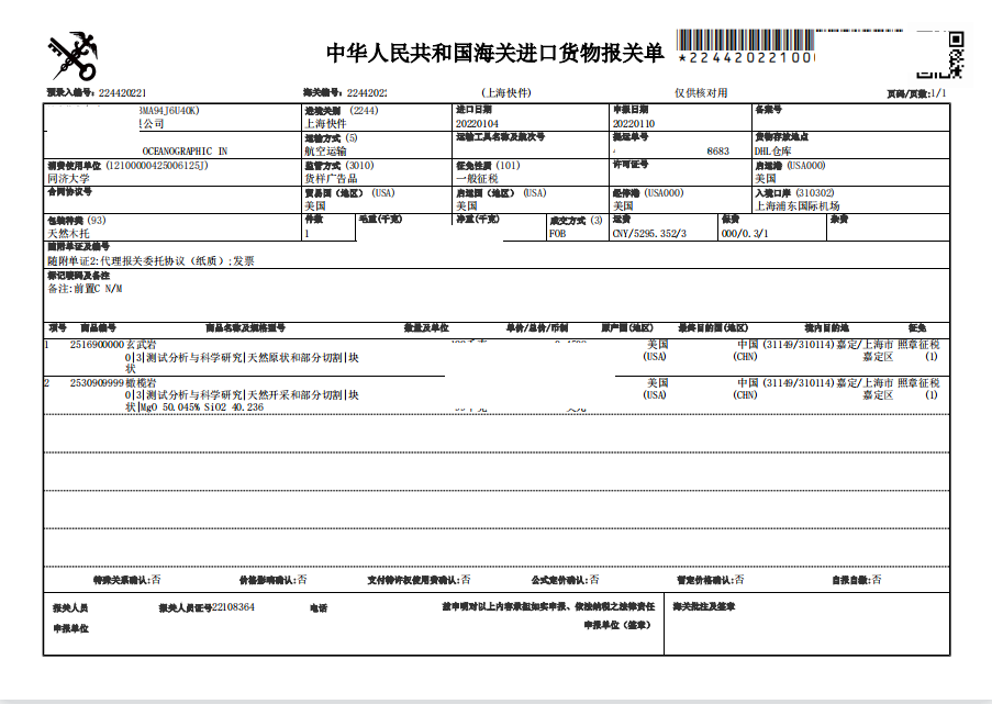 從美國進口一個托盤礦石,貨物是客戶通過美國同事采集樣品,然后空運發到上海,收貨地址是某大學醫學研究室。由于收貨人是該學院的醫學教授,所以對于貨物進口的流程不是很熟悉。在確認好價格后讓我們直接于負責空運的DSV聯系,DSV最初只讓我們提供申報抬頭,后在貨物即將到港才通知我們,需要我們提供液氮罐進口清關服務。因為貨物還有兩天就要到達,客戶本人又在美國,有著近12個小時的時差。所以在還沒有得到客戶的確認情況下,為了不耽誤清關時間,我便當即開始準備資料。后在晚上跟客戶說明情況后,客戶決定交由我們清關,并且將所做的清關資料發給客戶審核。