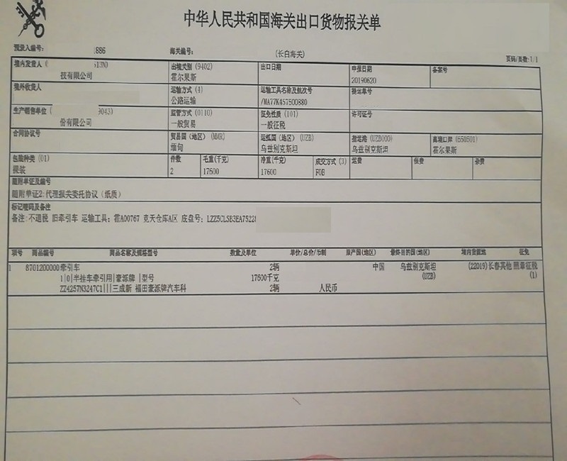 汽車出口報關。2019年06月20日協助汽車外貿公司從霍爾果斯口岸出口汽車到烏茲別克斯坦,當天通關審結,為汽車貿易出口通關提供了大大的便利!